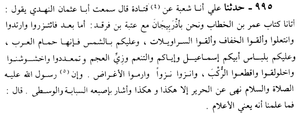 “اتانا كتاب عمر بن الخطاب ونحن بأذريبجان مع عتبة بن فرقد” وصلت رسالة عمر الى الجيش مع القائد عتبة بن فرقد وهم في اقليم اذربيجان ويقع فوق العراق. وكان يرشدهم الفاروق رضي الله عنه عن ما يرتدون وارشاده مثلا “وعليكم بالشمس فأنها حمام العرب” وعندما قال “وعليكم بلباس ابيكم إسماعيل” فأن الصحابة من قحطان وعدنان وقال لهم الخطاب عامةً ان يرتدوا مثل لبس ابيهم اسماعيل العربي.